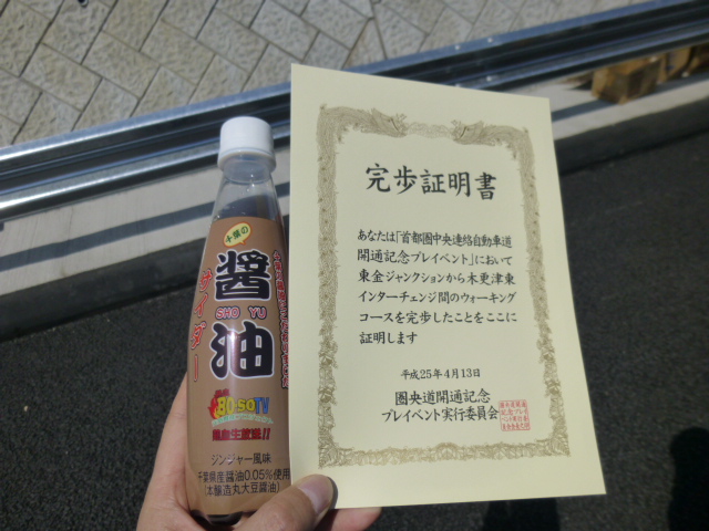 無事歩き終わると、完走証明書と記念品の醤油サイダー。