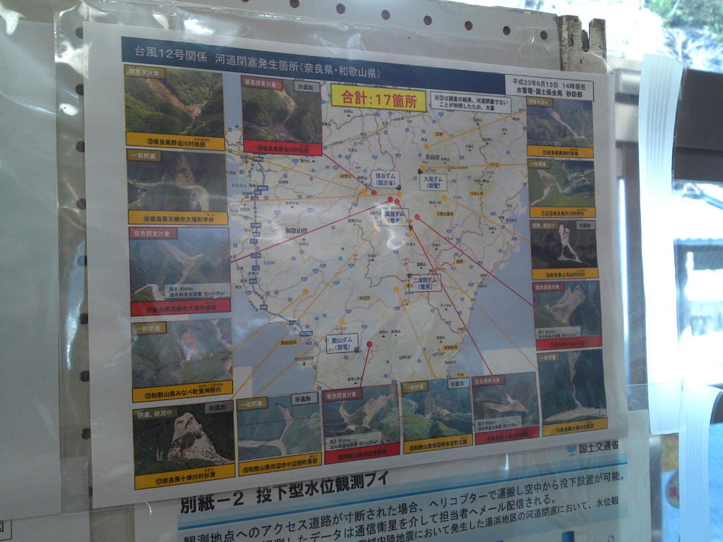 あちこち道路の陥没があったり、十津川や熊野川の河川敷にはがれきが積まれていたり、