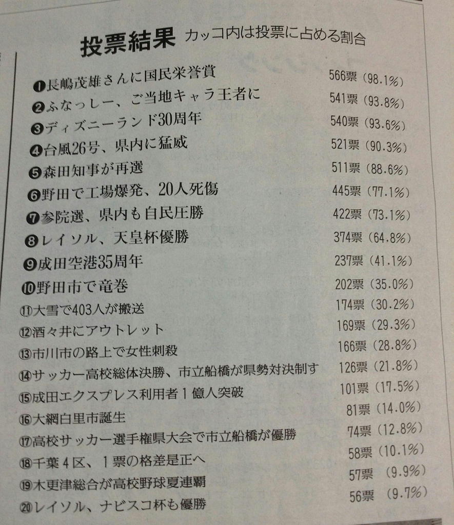 読売「読者が選ぶ県内10大ニュース」(12/21読売千葉版紙面、%は投票に占める割合)