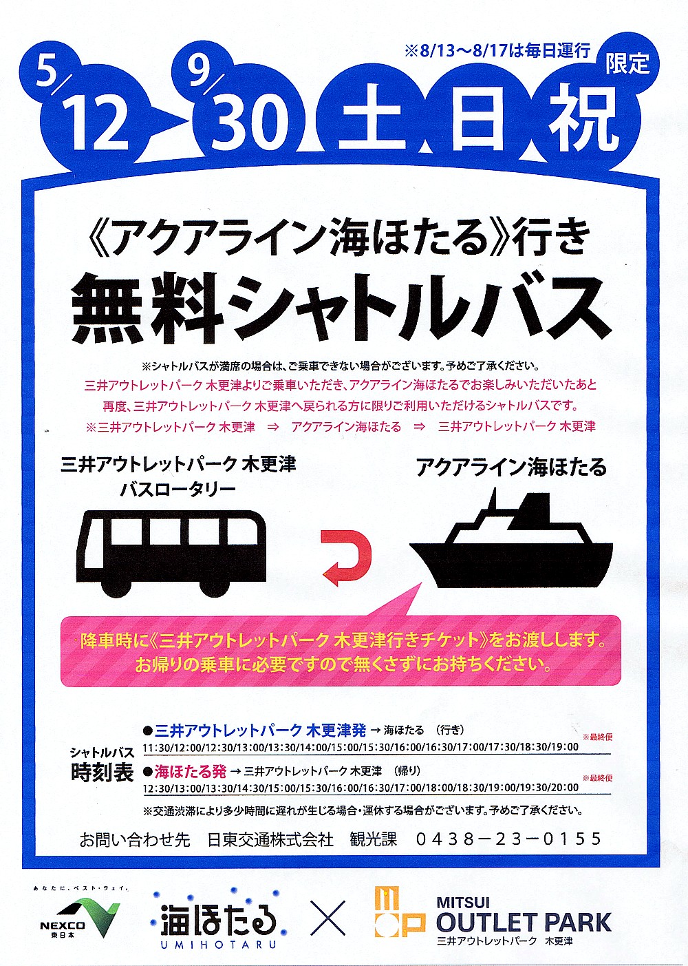 土日祝日限定で、 木更津アウトレットから海ほたるまで、