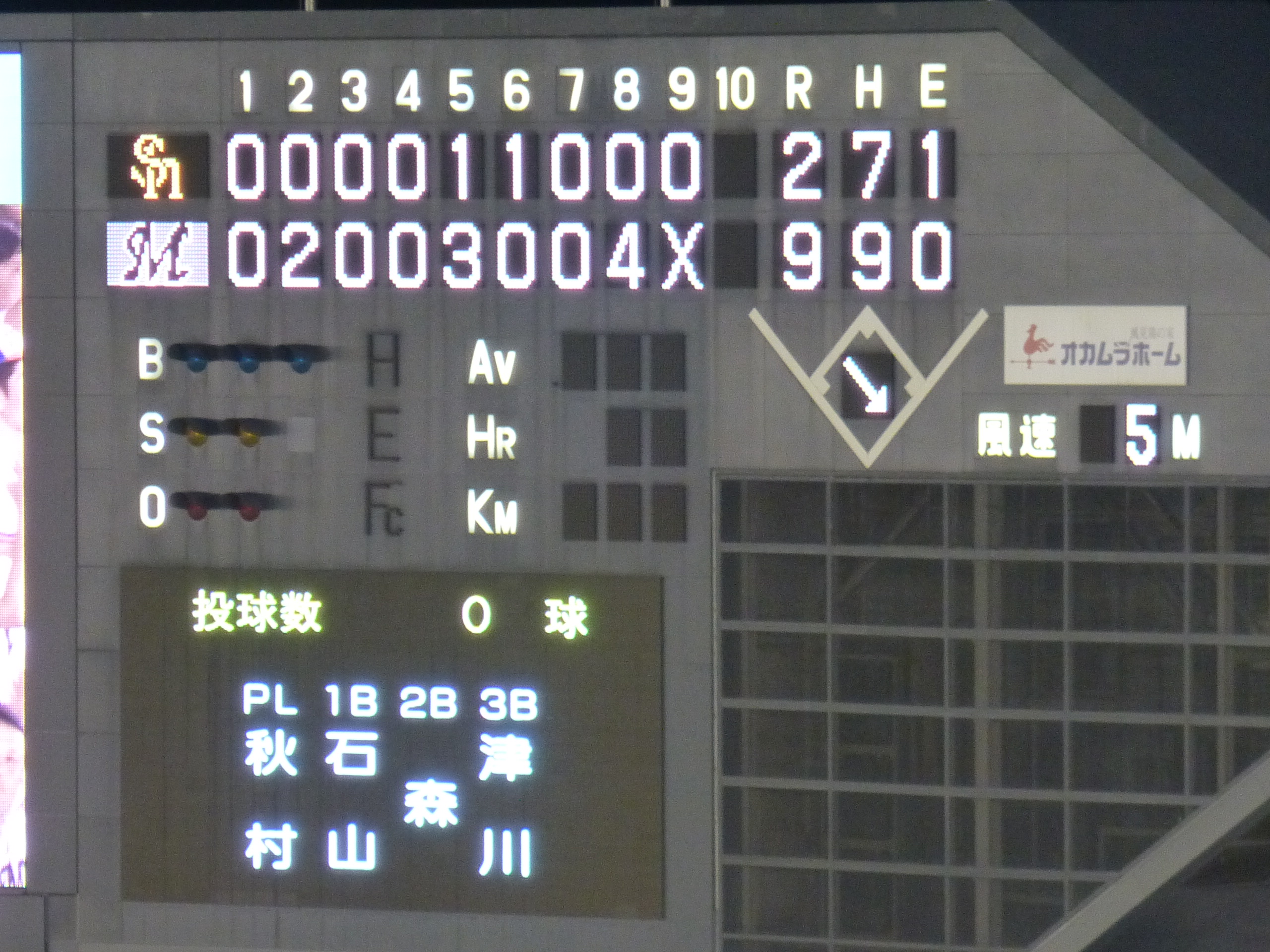 4番ホワイトセルのホームラン、荻野のタイムリー、成瀬10勝目。