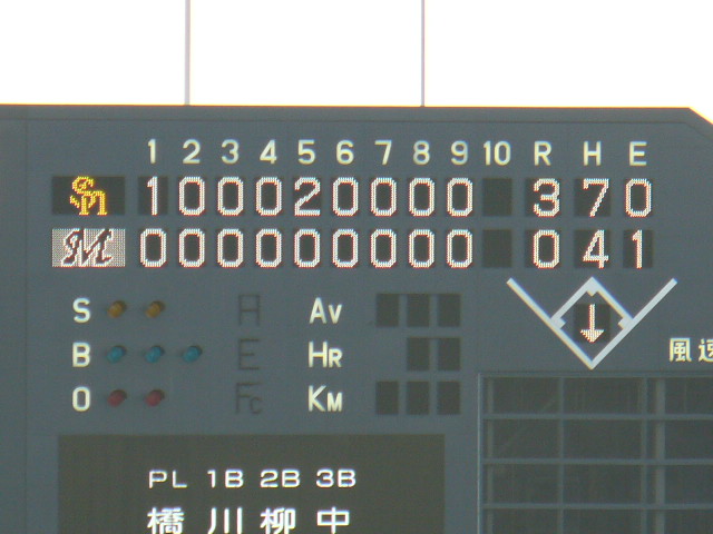 8回、1死2塁から外野フライでサブローが戻らない凡ミス。アウトカウント間違えたんだろうか…。