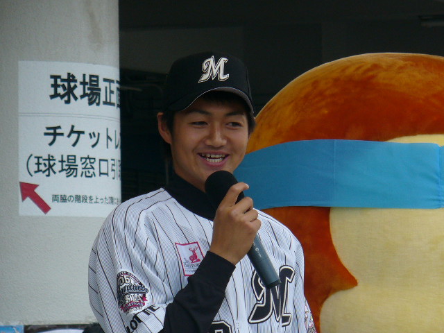 試合前、正面ステージで唐川投手が清水直行投手とともに登場!