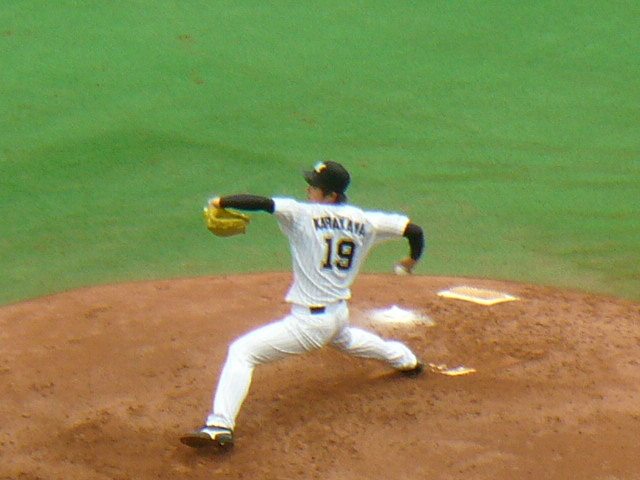唐川がマウンドへ向かう。ライトスタンドには唐川の似顔絵フラッグ。