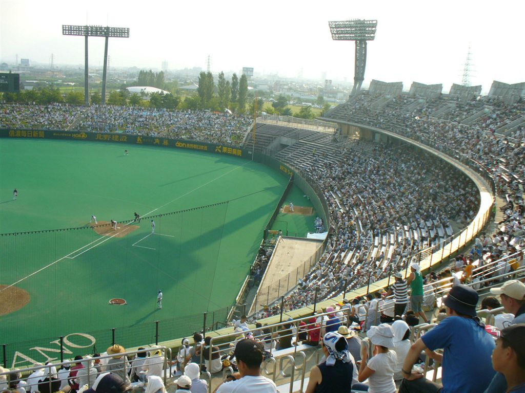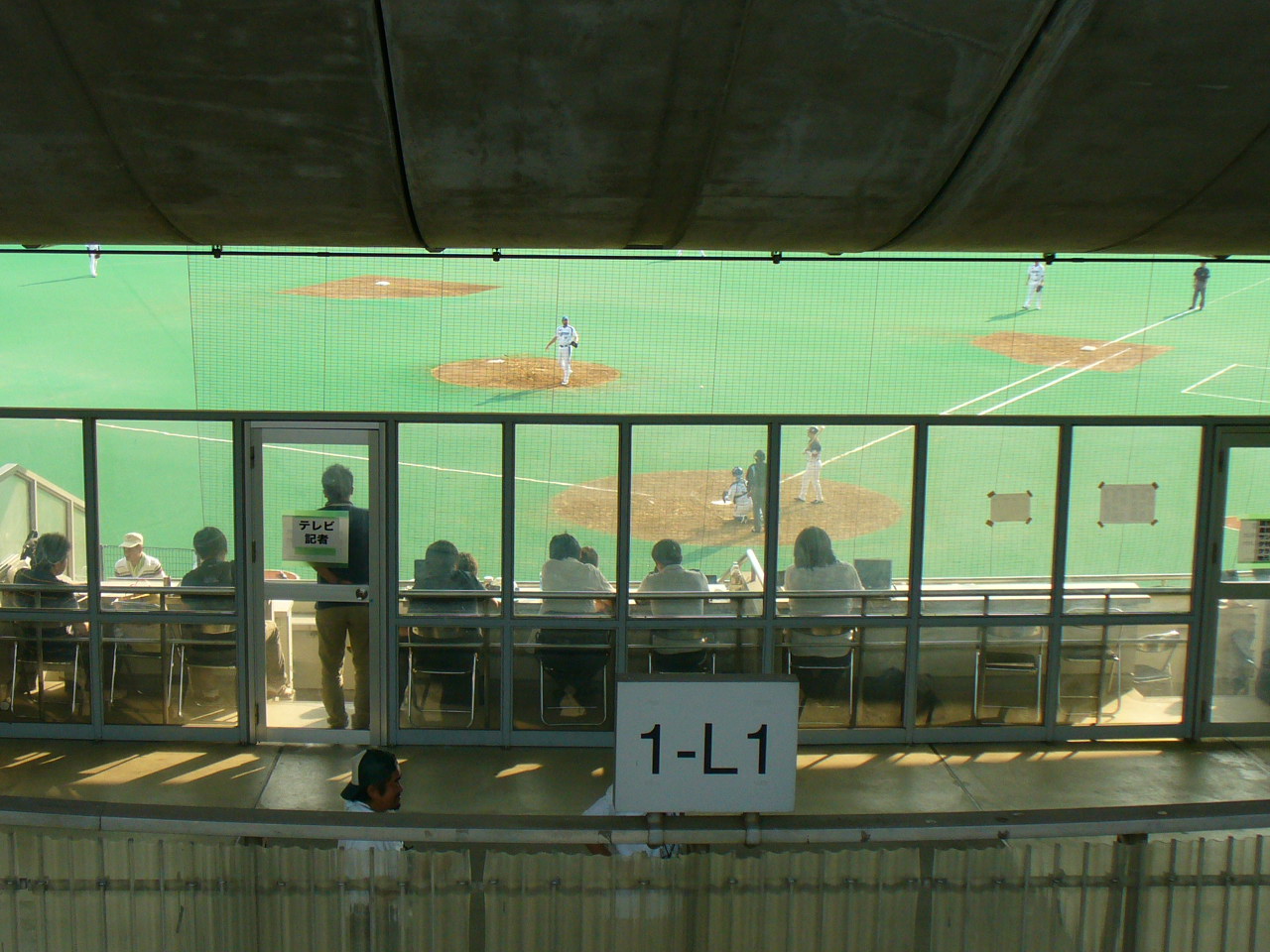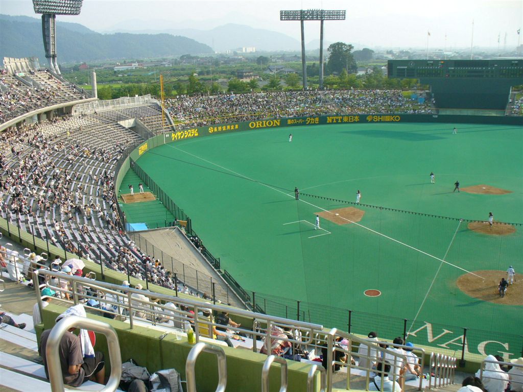 球場全景。内野2階席があって、外野が芝生だったりと、