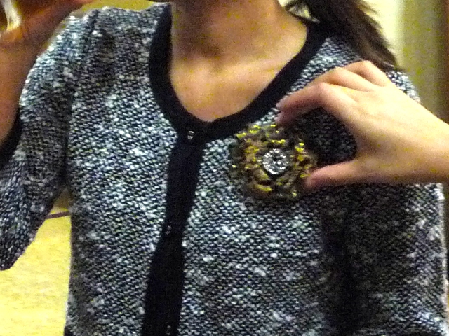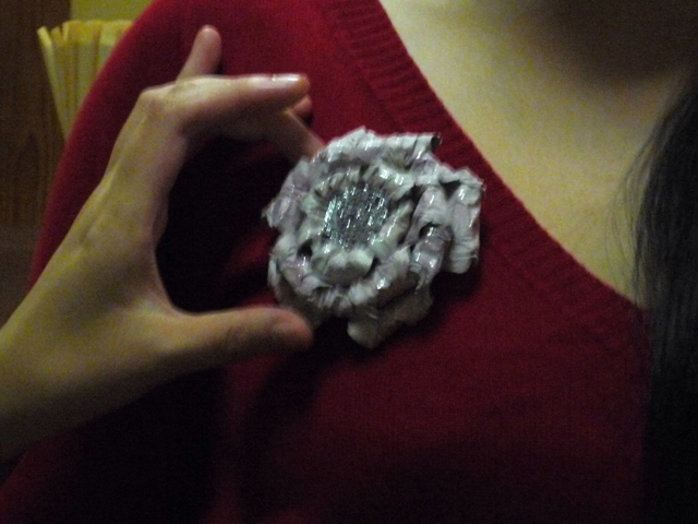 ブローチは、新聞紙で作ったものだとか。